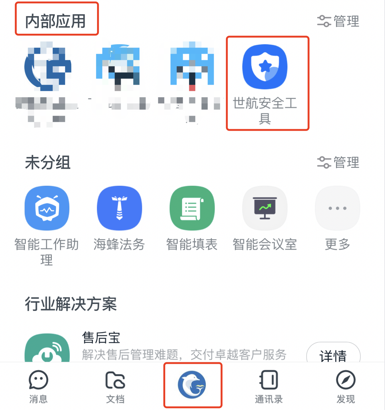 1、打开钉钉,选择最下方"工作台", 找到"内部应用"列表,进入 "世航安全应用工具":